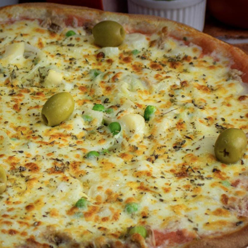 Atum, palmito, ervilha, ovo, bacon, cebola e catupiry.