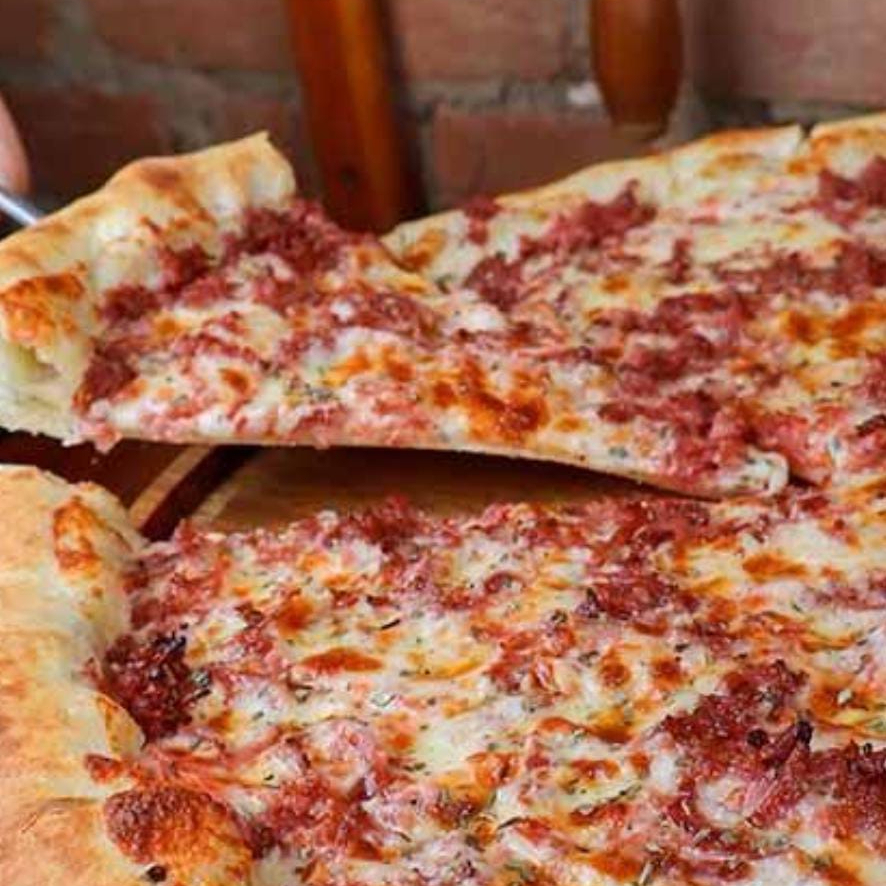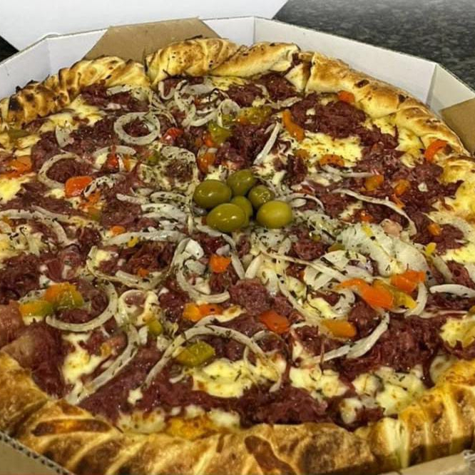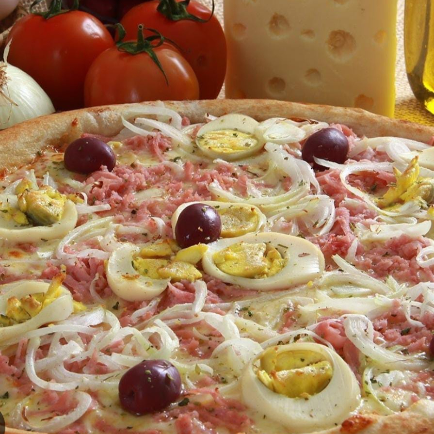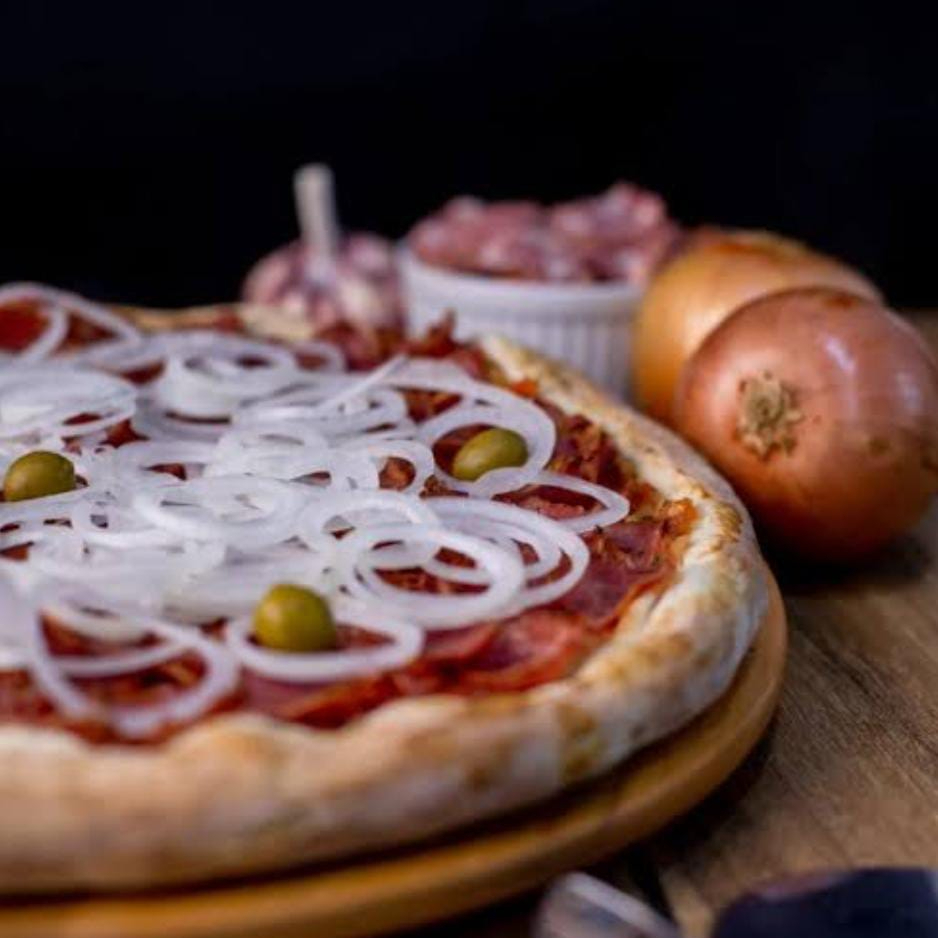 Pizza quentinha de Calabresa de qualidade com bastante cebola para compartilhar com os amigos!
