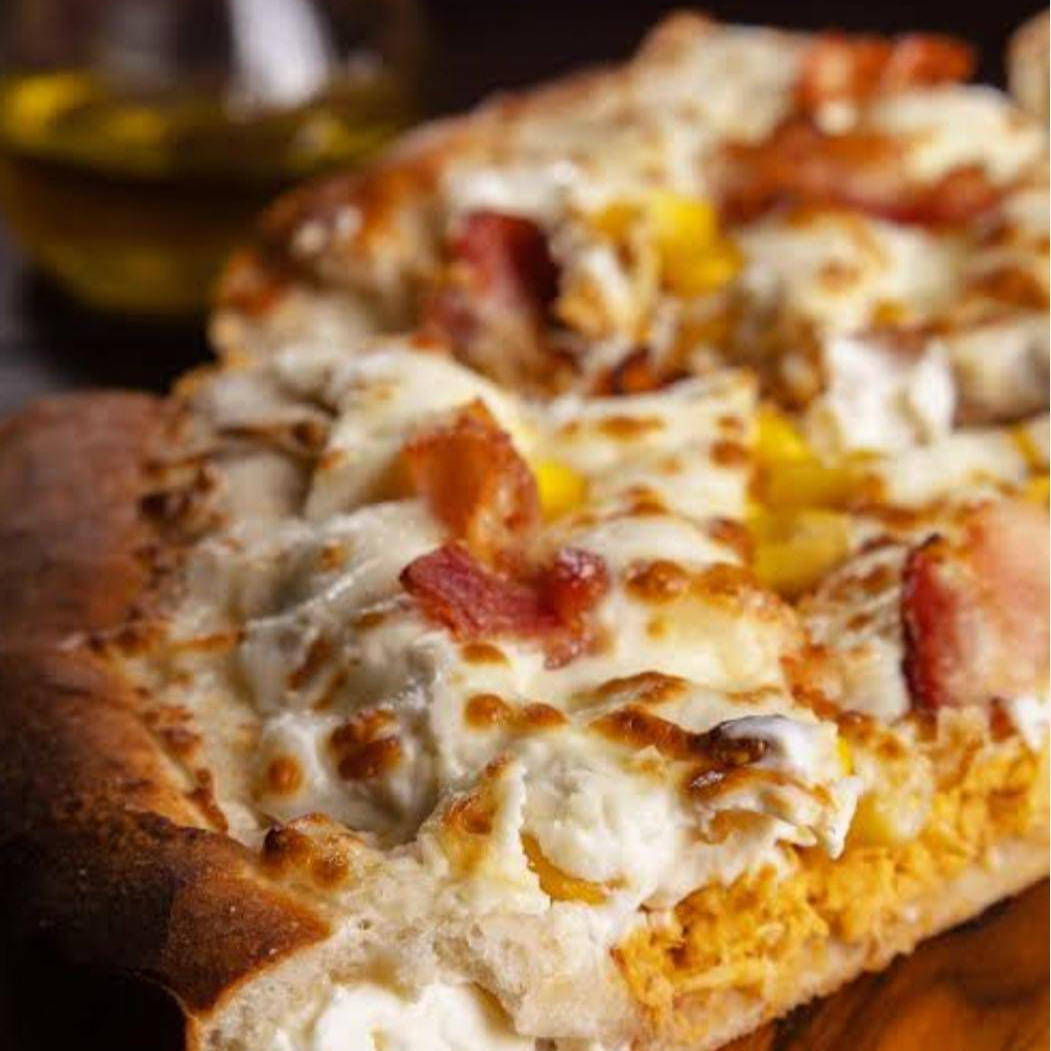 Frango, milho, mussarela e bacon.