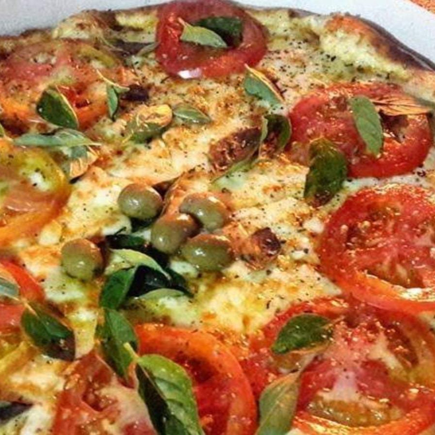 Tomate ao alho e óleo, mussarela e azeitonas pretas