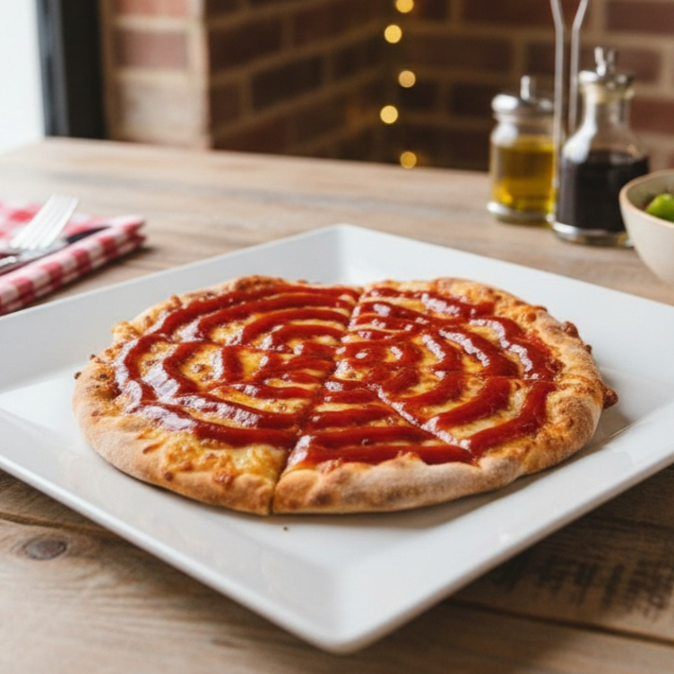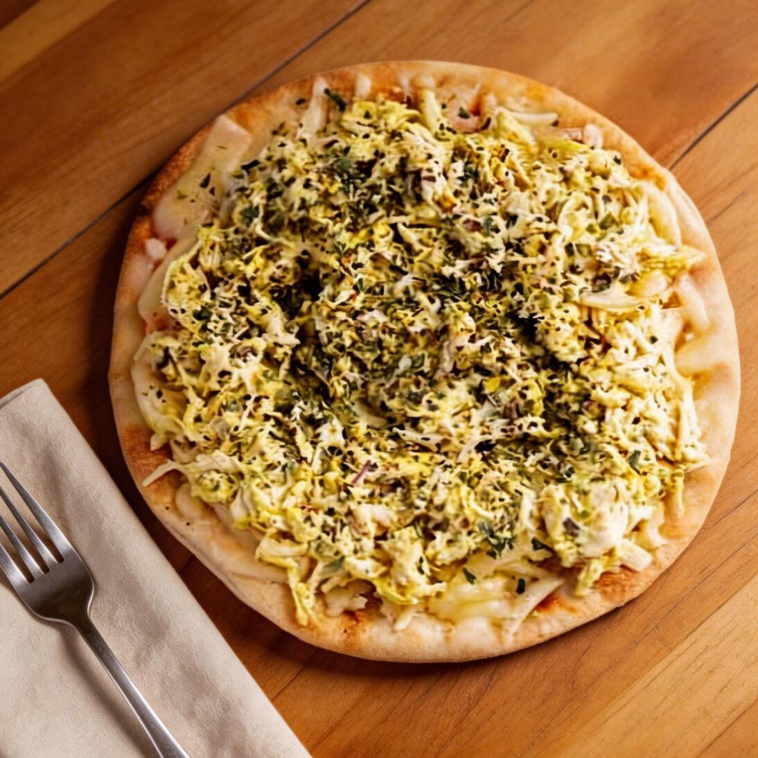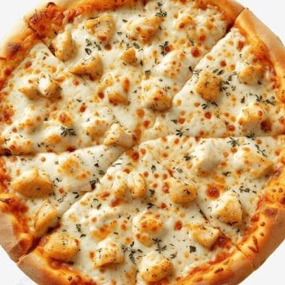 Saborosa pizza com frango desfiado e catupiry, finalizada com orégano.