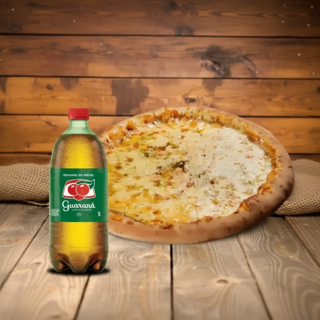 Pizza broto de mussarela dourada (4 fatias) com queijo derretido + Guaraná Antárctica 600mlbem gelado. Combinação perfeita para matar a fome com estilo!