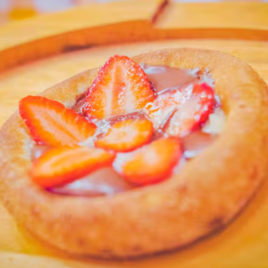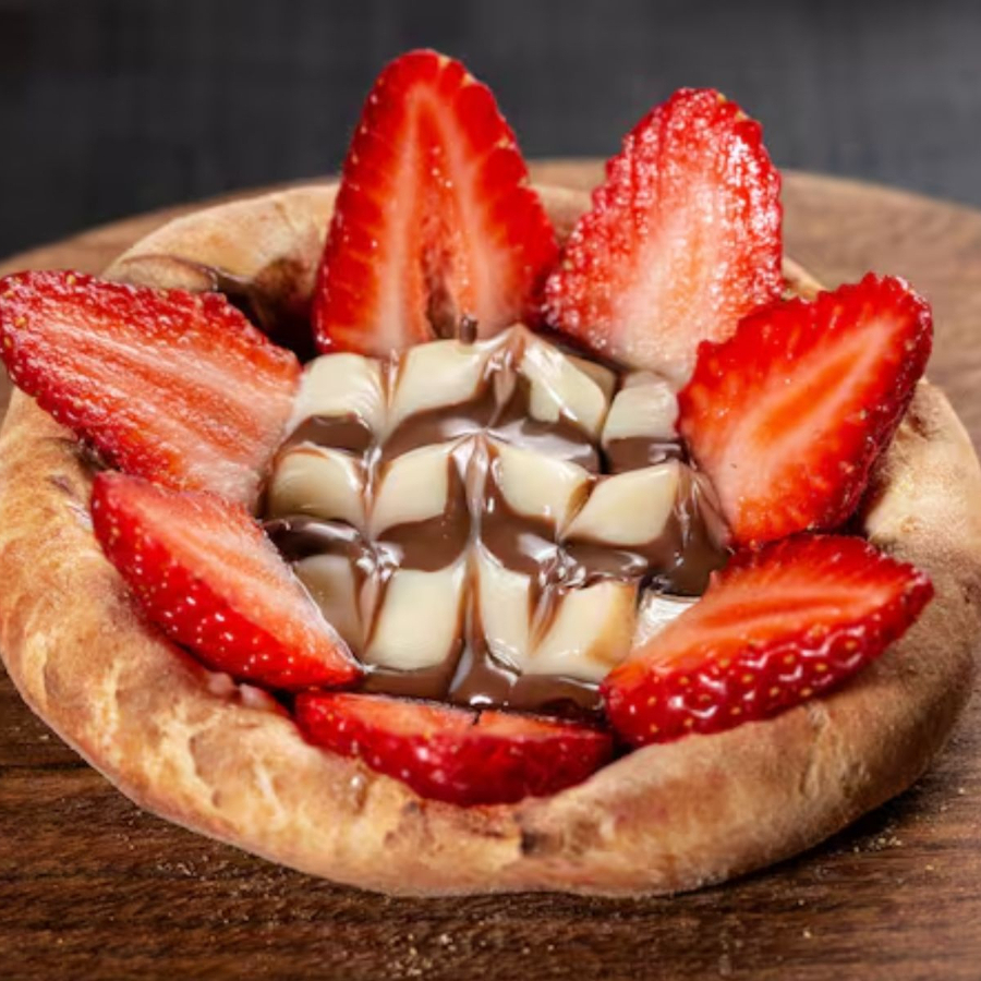 Esfiha recheada de leite condensado consistente, nutella e morango.