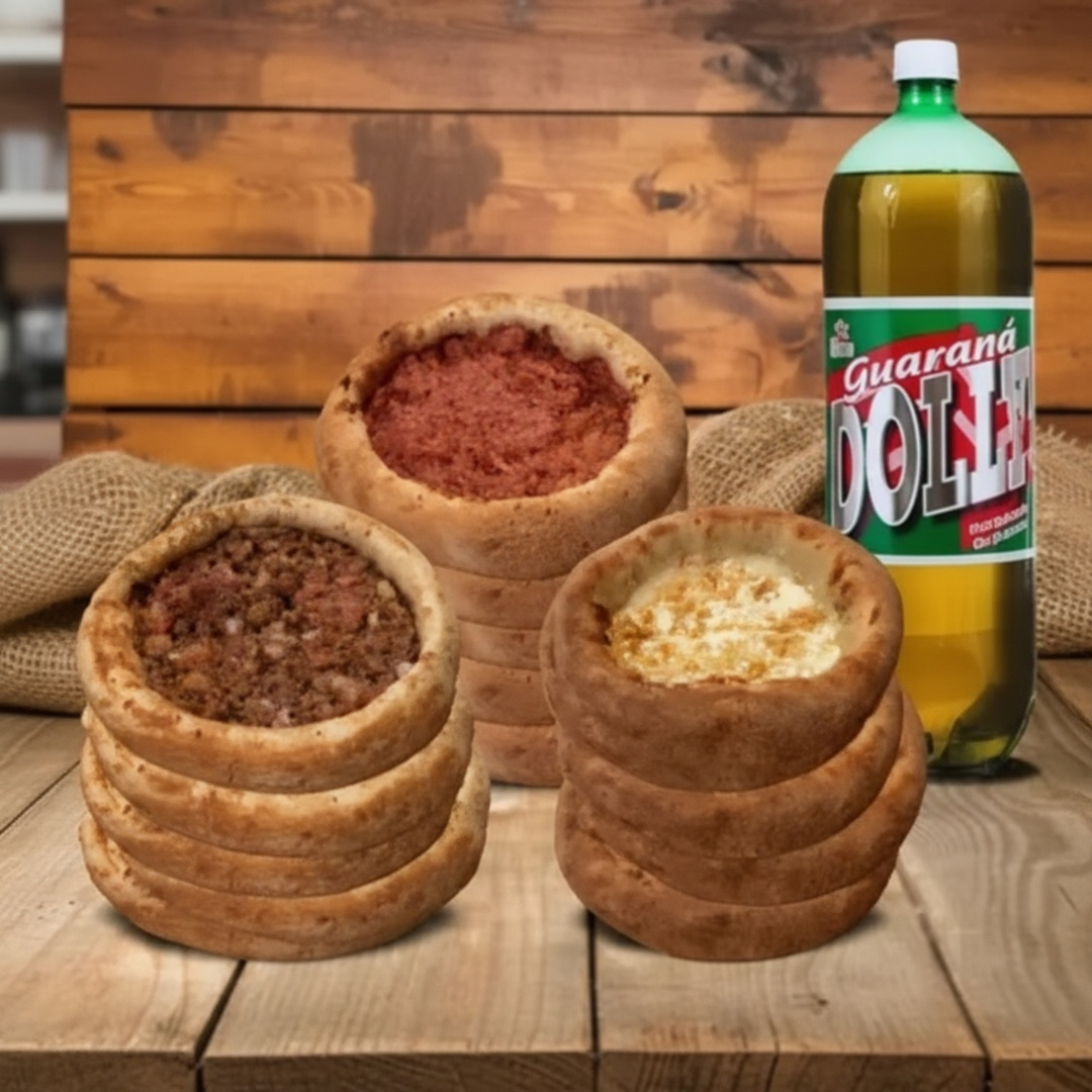 15 esfihas fresquinhas (5 carne suculenta, 5 calabresa defumada, 5 queijo derretido) + Dolly geladinha. Praticidade e sabor em cada pedaço!