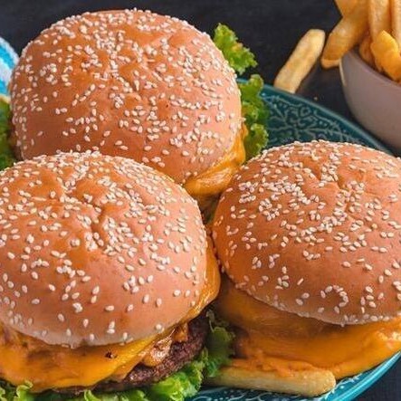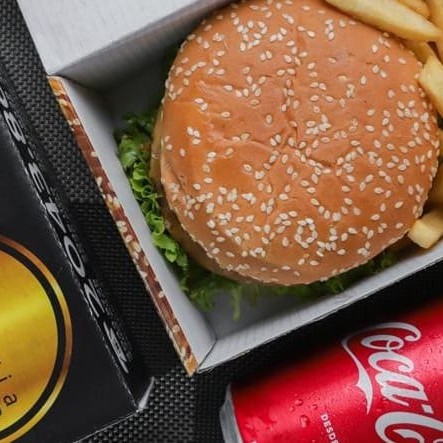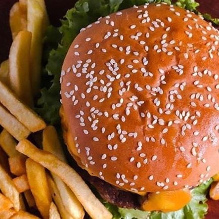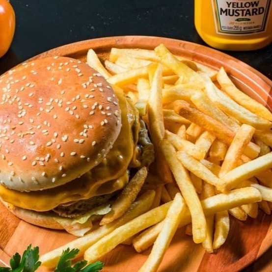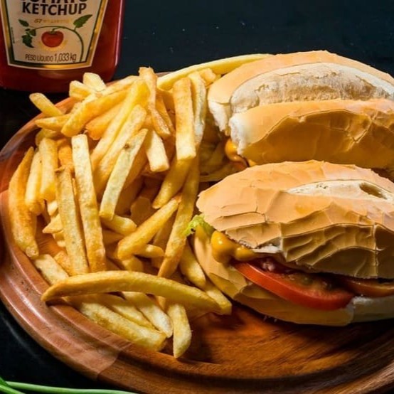 1 X-Burguer (hambúrguer e queijo prato) + batata + esfiha de chocolate + suco lata