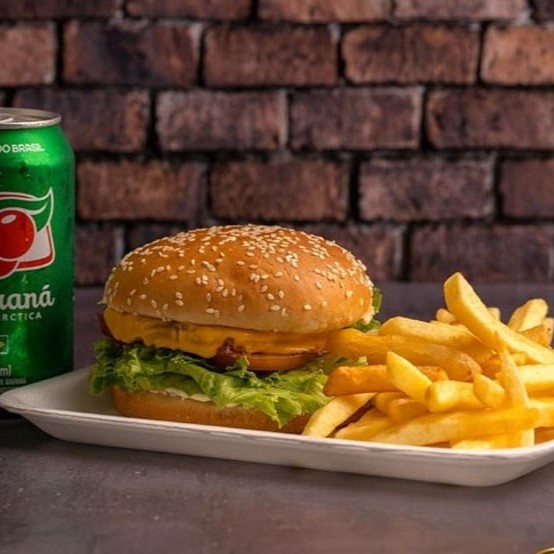 1 Lanche X-Salada (hambúrguer, queijo prato, tomate, alface e maionese) + batata + refrigerante lata