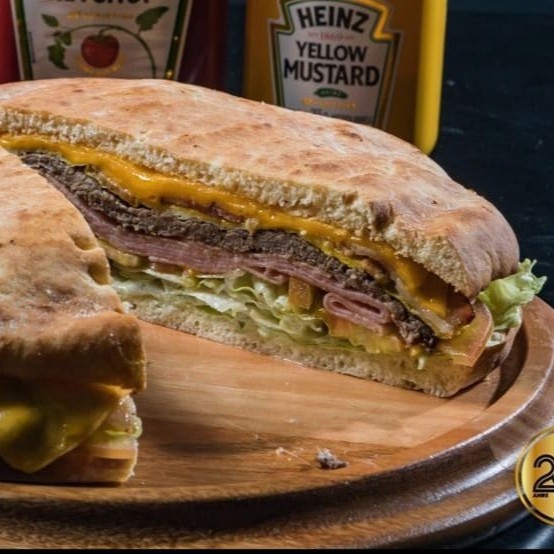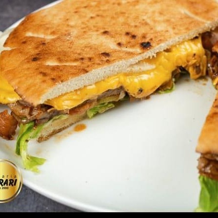 Filé mignon, presunto, ovos, bacon, queijo prato, tomate, alface e maionese no pão sírio