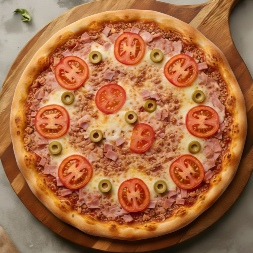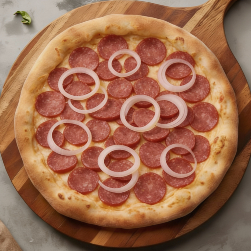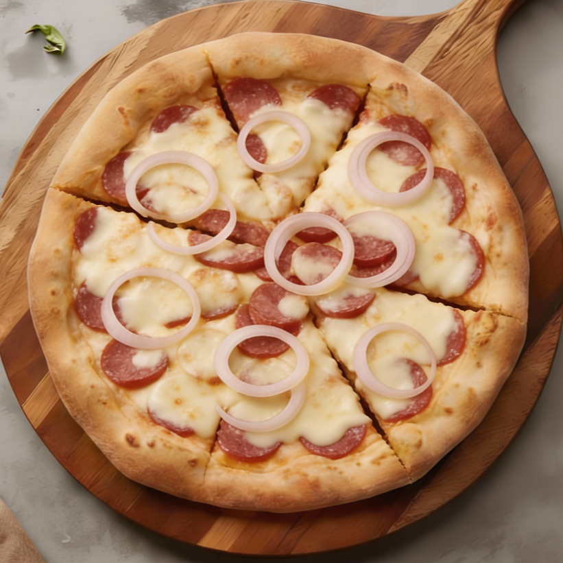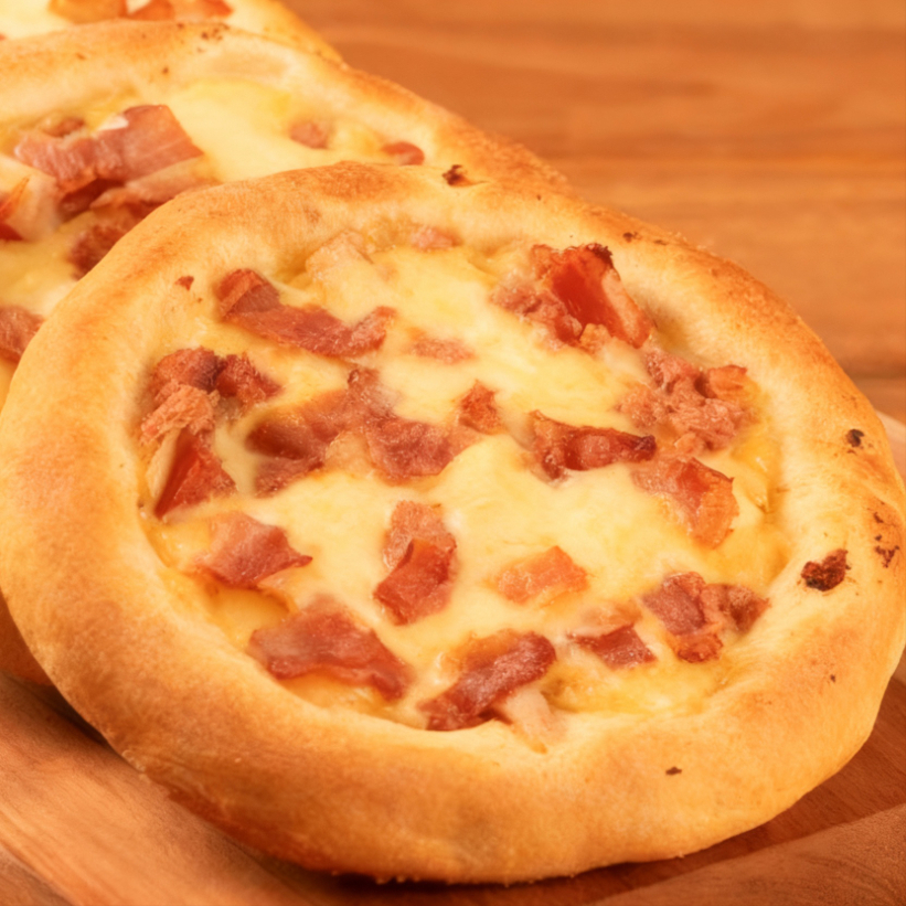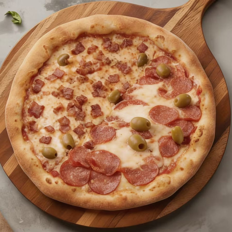 Metade Toscana com Linguiça bem temperada e Textura Suculenta; metade Bacon com Fatias crocantes e Sabor marcante. Massa Fina, Bordas Douradas e Aroma Intenso. Uma Combinação Perfeita para quem busca Força no Sabor e personalidade em cada Fatia.