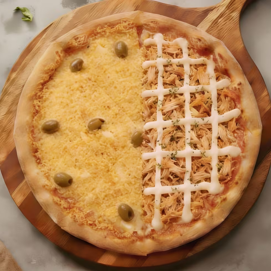 Metade Dois Queijos com Catupiry e Mussarela derretida e metade Frango com Catupiry com Recheio suave e Cremosidade marcante. Massa Fina, Bordas Douradas e Aroma irresistível. Uma Combinação Completa para quem busca Sabor, Intensidade e aquele toque especial em cada Fatia.