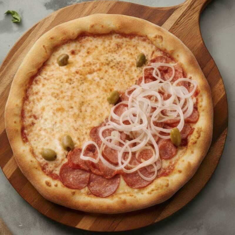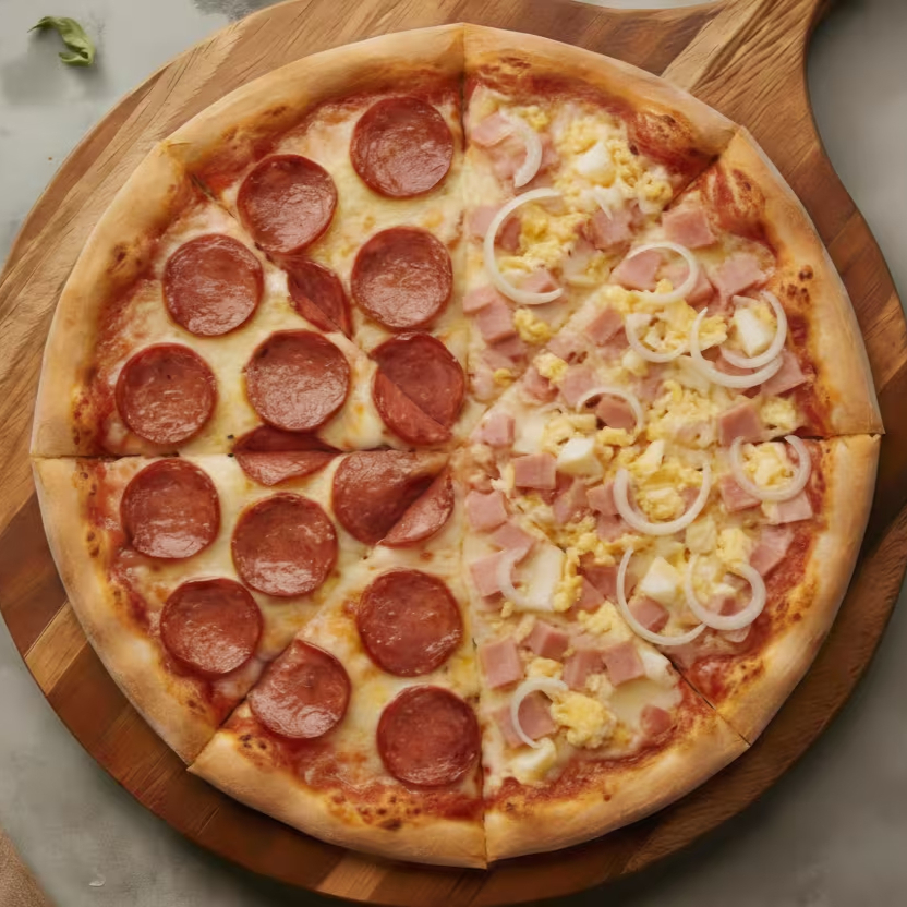 Metade Pepperoni com Fatias saborosas e Toque Levemente Picante; metade Portuguesa com Presunto, Ovo, Cebola e Azeitonas bem distribuídas. Massa Fina, Bordas Douradas e Aroma Marcante.