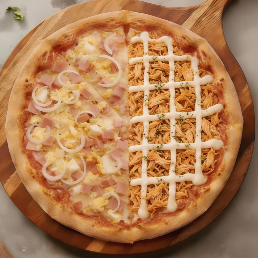 Metade Frango com Catupiry Metade Portuguesa com Presunto Fatiado, Mussarela derretida , Ovos Cozidos, Cebola Ervilha e Tomate ; metade Frango com Catupiry com Recheio suave e Cremosidade marcante. Massa Fina, Bordas Douradas e Aroma irresistível. Uma Combinação Completa para quem busca Sabor, Intensidade e aquele toque especial em cada Fatia.