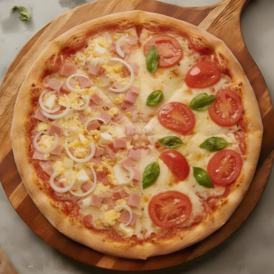 Metade Portuguesa com Presunto, Ovo, Cebola e Azeitonas bem distribuídas; metade Marguerita com Mussarela cremosa, Tomate fresco e Toque de Manjericão. Massa Fina, Bordas Douradas e Aroma Marcante.