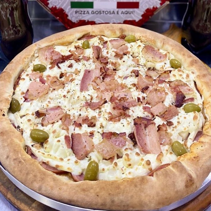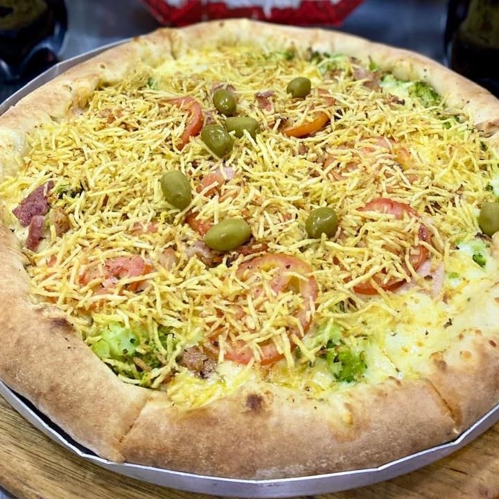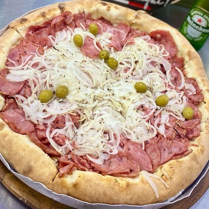 Dona Chica: frango desfiado, brocólis temperado, mussarela, e bacon. Calabresa: calabresa fateada com cebola.