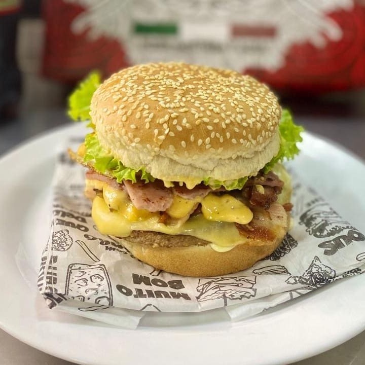 Hambúrguer, queijo prato, rodelas de tomate, alface, bacon e maionese.