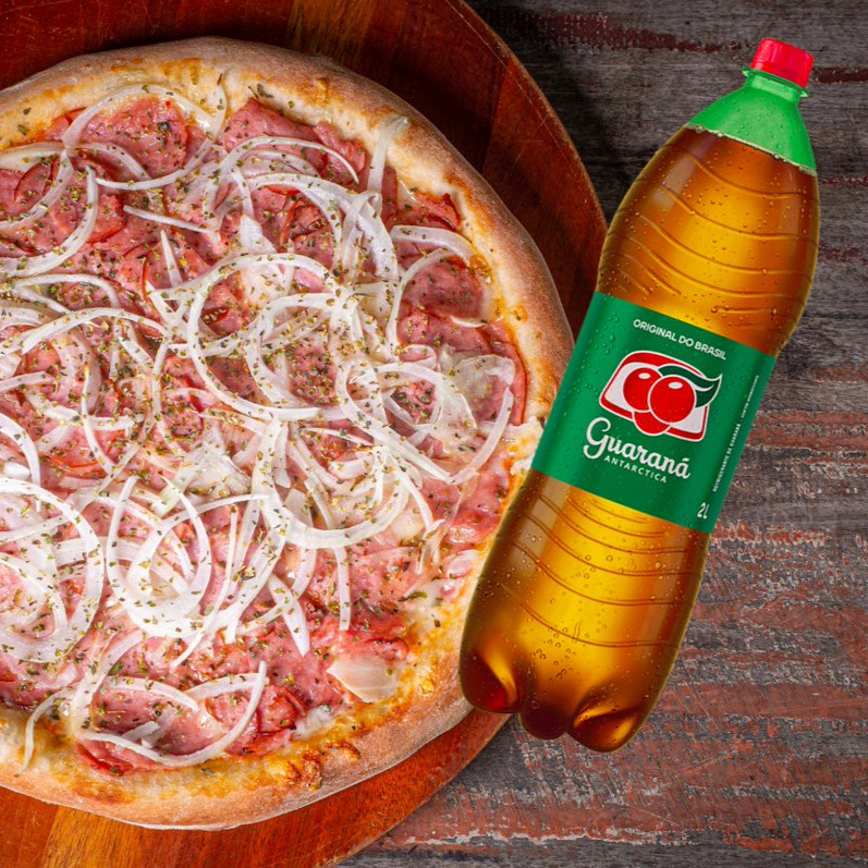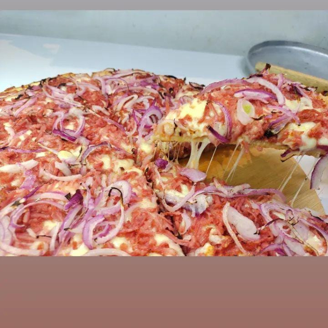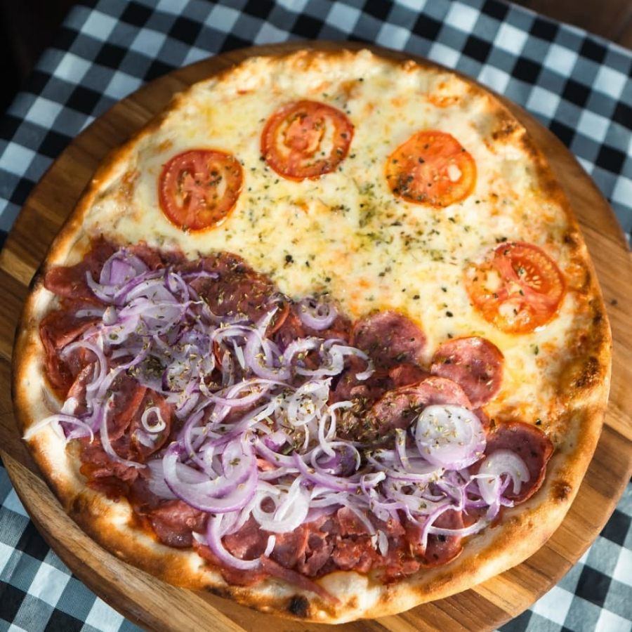 Molho de tomate pelati, mussarela, calabresa defumada e moída e cebola argentina