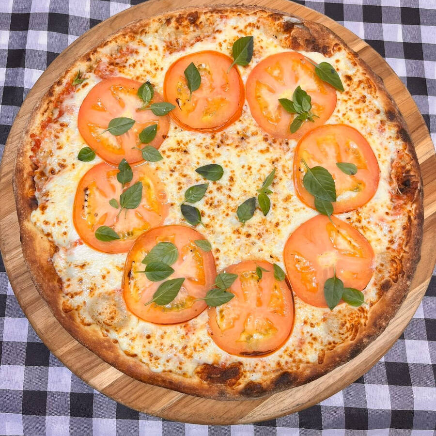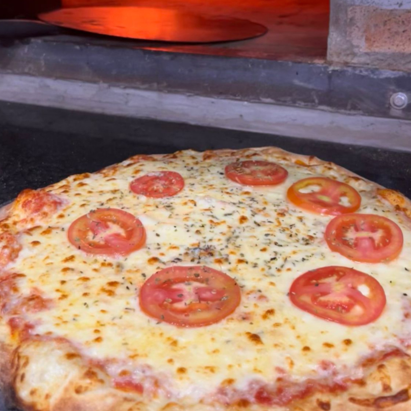 Massa napolitana de media fermentaçao, Molho de tomate natural,Mussarela, tomate,Azeitona e oregano