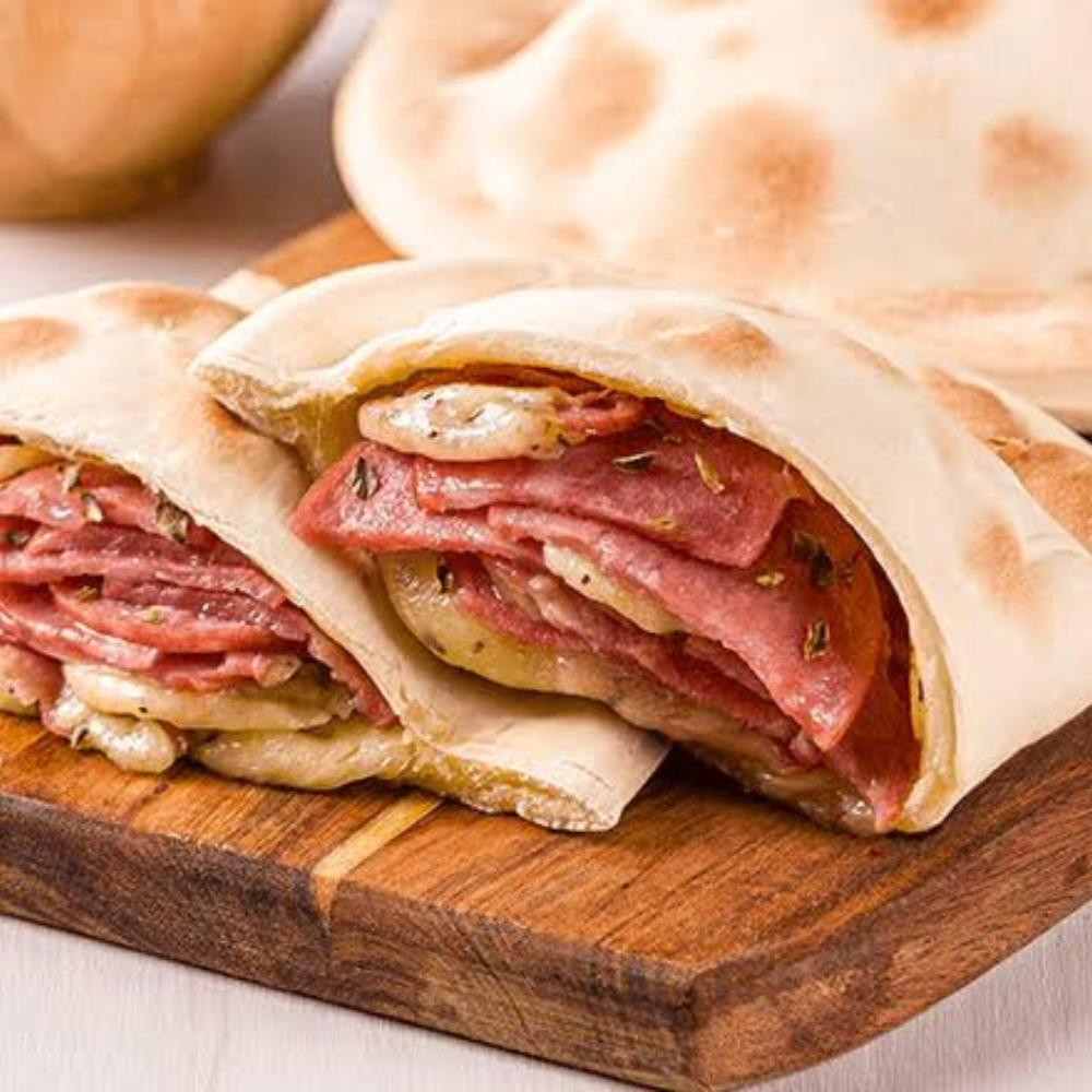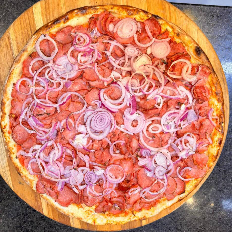 Molho de tomate paelati, calabresa defumada em finas fatias, anéis de cebola argentina, um fino toque de orégano e azeitona sem caroço