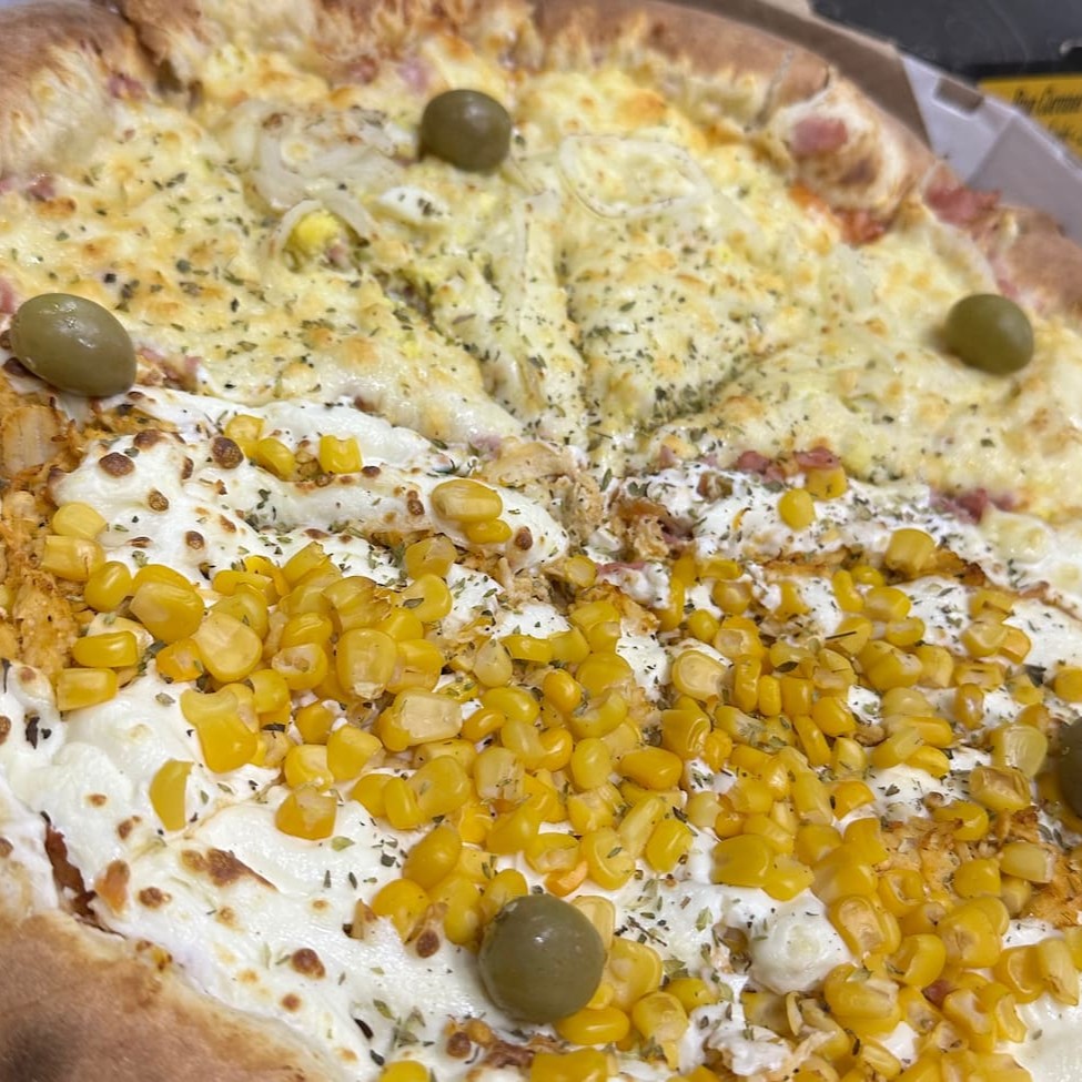 Molho de tomate da casa, 1/2 presunto, ovos cebola e mozarela e 1/2 frango desfiado, requeijão cremoso e milho