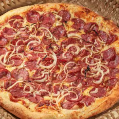Massa artesanal crocante, molho de tomate levemente picante, muçarela derretida, pepperoni defumado em rodelas, azeitonas pretas e orégano fresco.