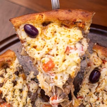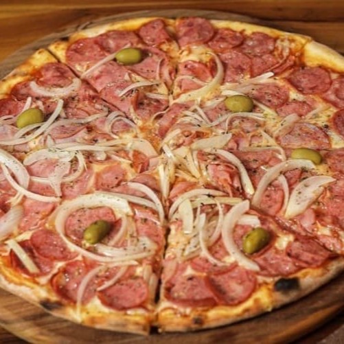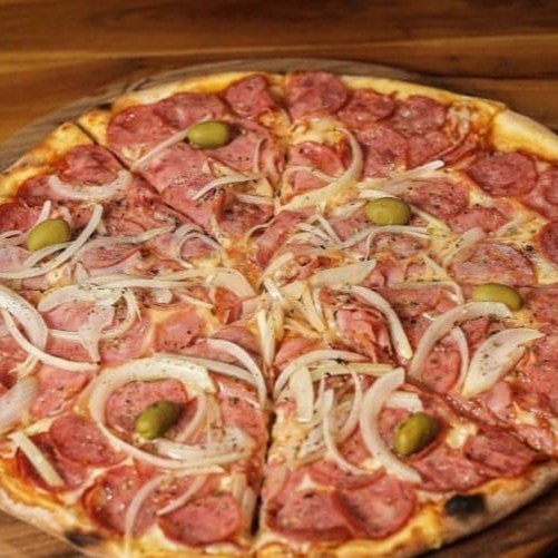 Massa artesanal crocante, molho de tomate levemente picante, muçarela derretida, pepperoni defumado em rodelas, azeitonas pretas e orégano fresco.
