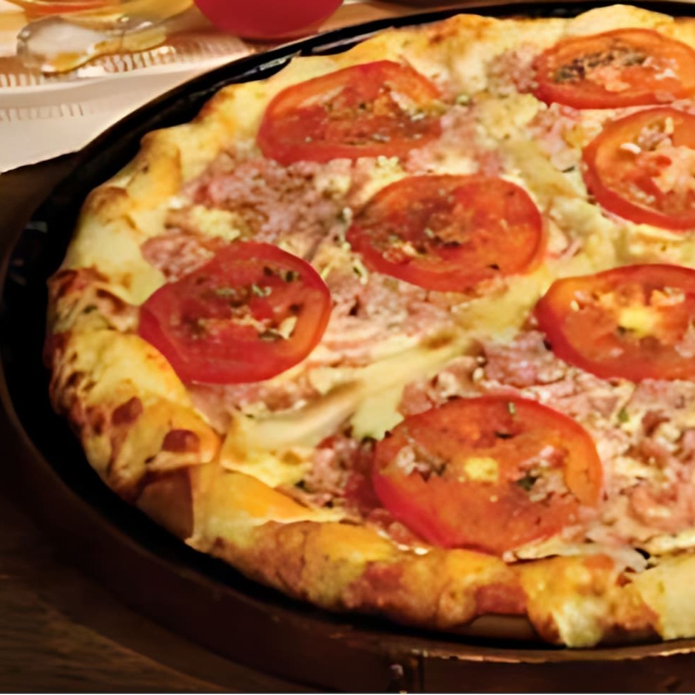 Massa artesanal no ponto, molho de tomate especial, muçarela derretida, presunto suculento, ervilhas frescas, ovos cremosos, cebola caramelizada, azeitonas selecionadas e orégano.