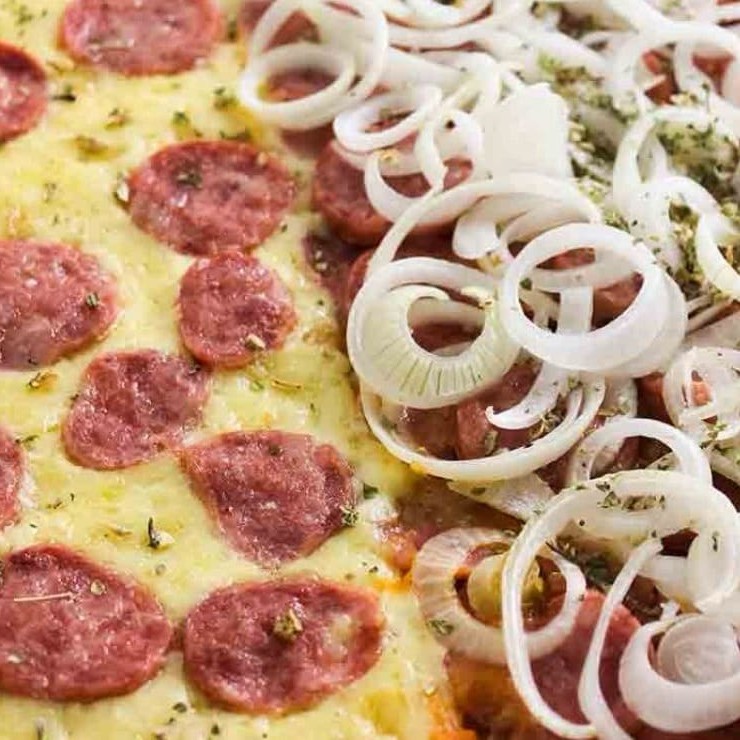 Pizza meio a meio: uma metade com calabresa fatiada e cebola, orégano e azeitonas . Massa de fermentação natural e molho artesanal de tomate em ambas. Clássica, saborosa e perfeita para dividir!