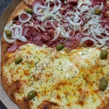 Você pode escolher entre 3 opções: 1 inteira calabresa, 1 inteira mussarela ou 1/2 mussarela e 1/2 calabresa. Pizza grande (8 fatias). A borda cheddar acompanha a sua pizza! cheddar Original, melhor cheddar do mercado!