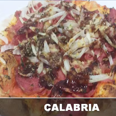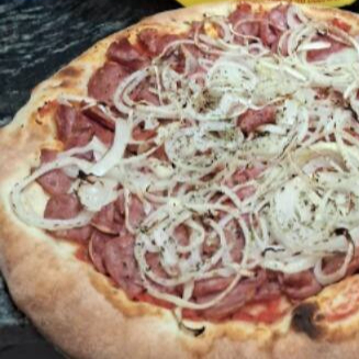 Calabresa fatiada, cebola, parmesão e molho barbecue.