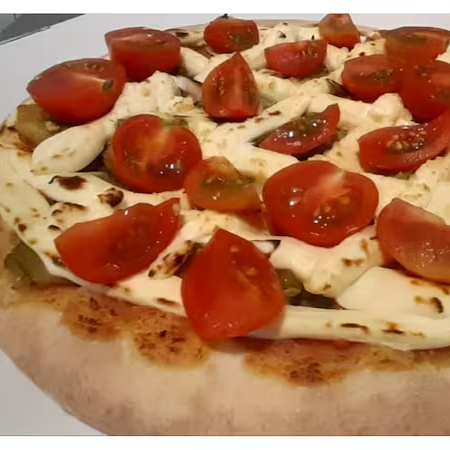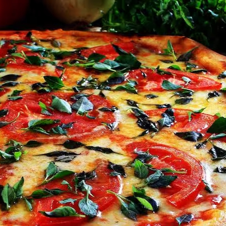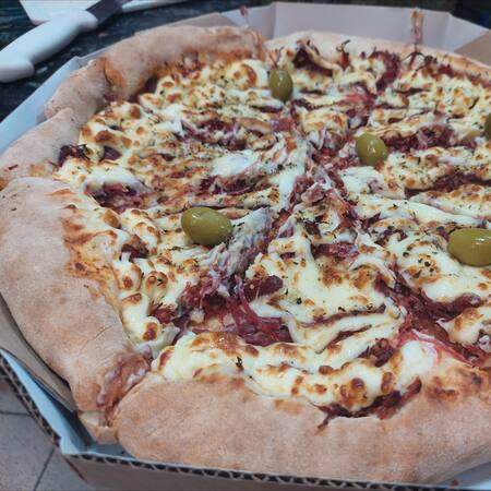 Mussarela, pepperone, bacon, molho barbecue e manjericão.