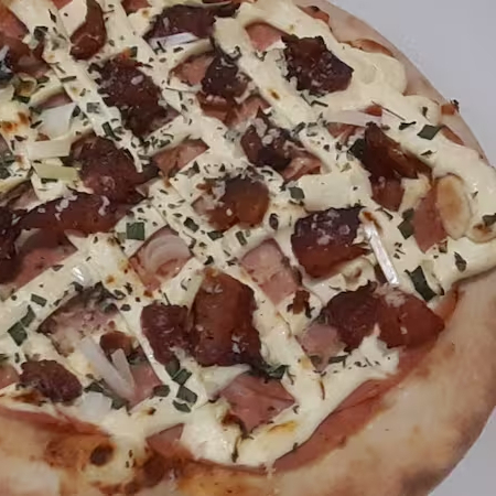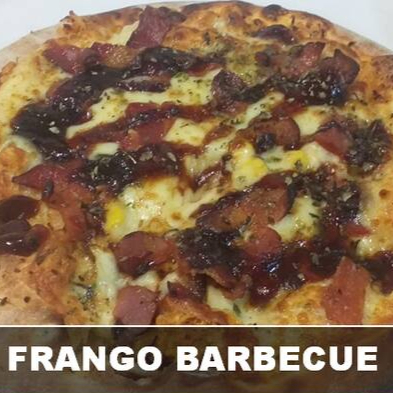 Frango temperado, milho, mussarela, bacon e molho barbecue