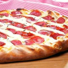 Calabresa fatiada com baixo teor de sódio, cobertura de mussarela.