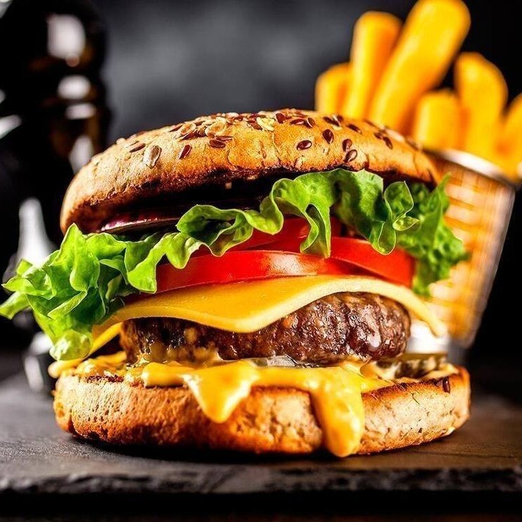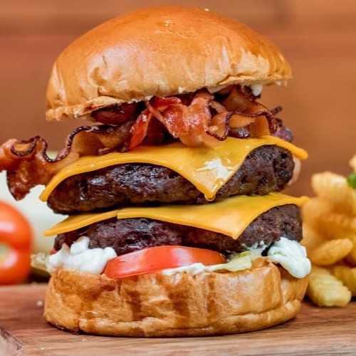 Pão artesanal, 2 hambúrgueres de carne bovina 160g, queijo mussarela, alface americana, tomate, cebola roxa, picles , molho verde e molho rach e crispy de cebola. *contém glúten*