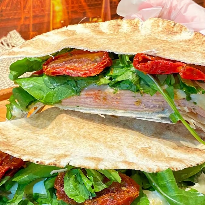 Mussarela de búfala, requeijão cremoso , peito de peru, rúcula e tomate seco