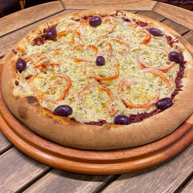 Carne seca desfiada, cebola, pimentão, mussarela.