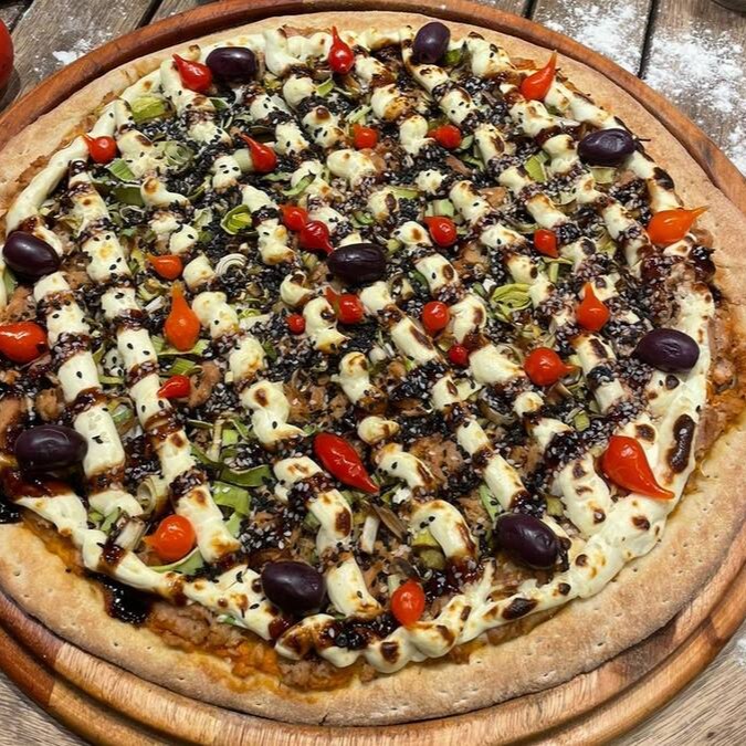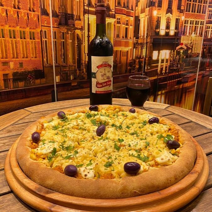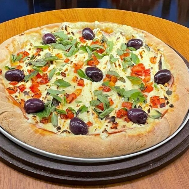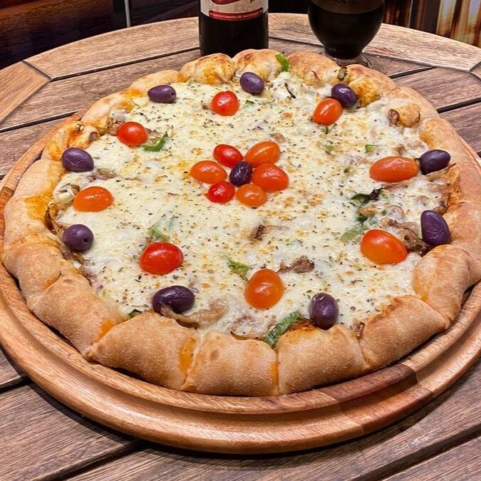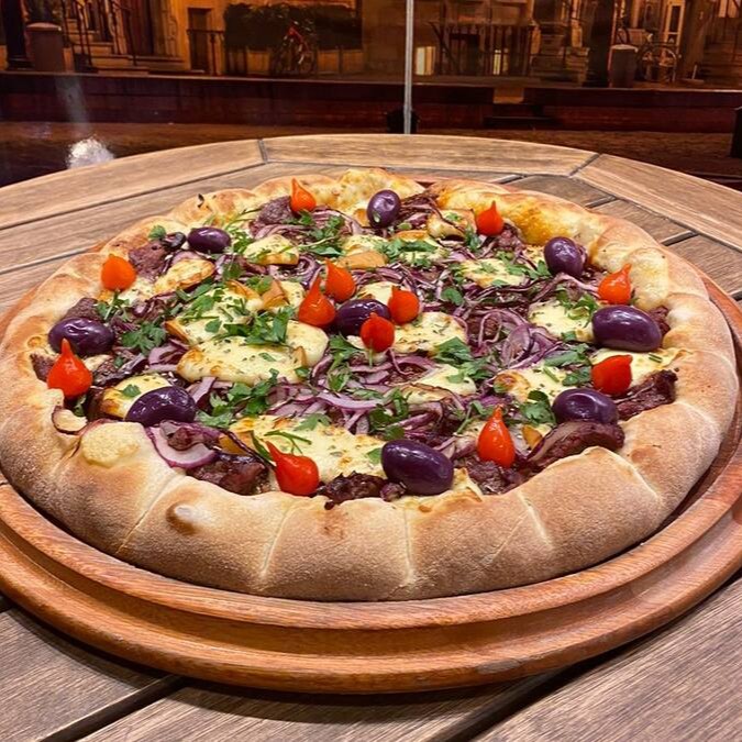 Filé Mignon Temperado No Alho, Cebola Roxa, Mussarela, Provolone, Salsa, Molho Gourmet, Pimenta Biquinho, Borda De Molho De Alho.