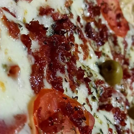 Calabresa fatiada coberto com mussarela tomates e bacon