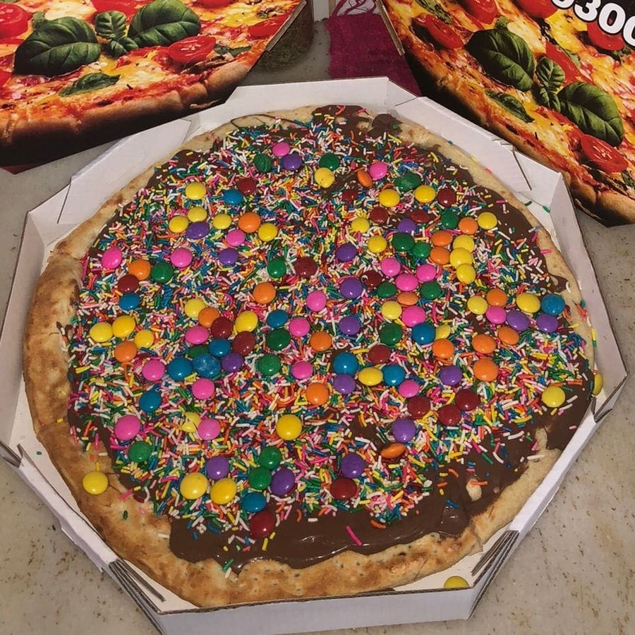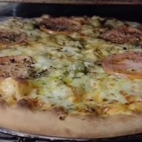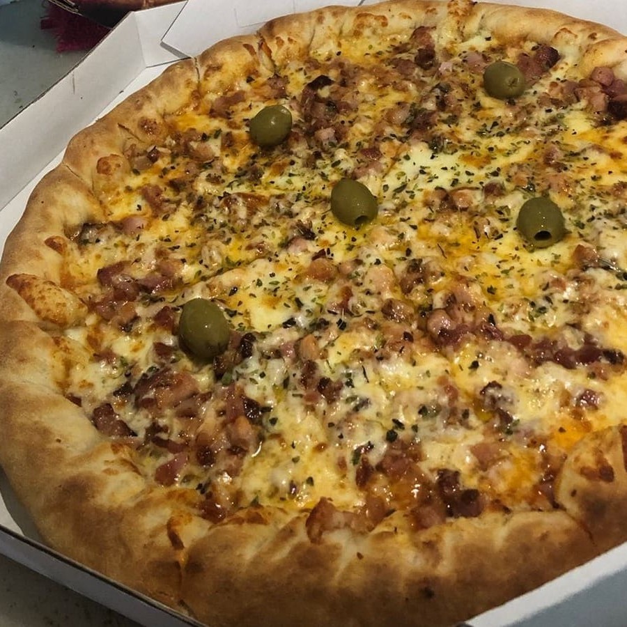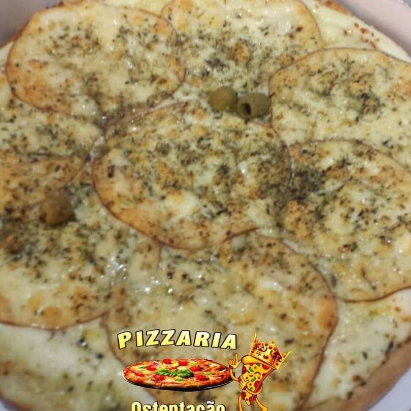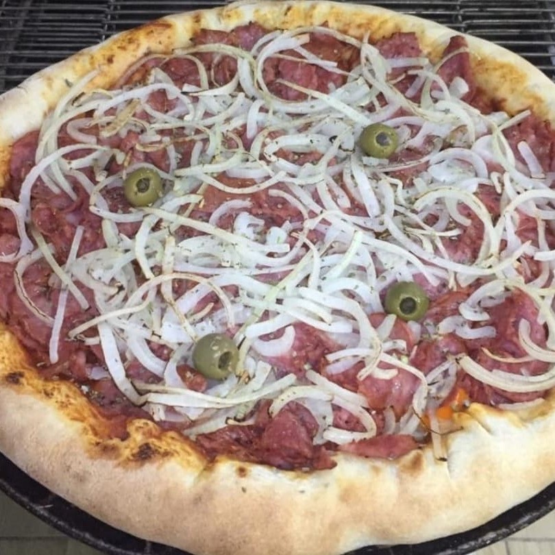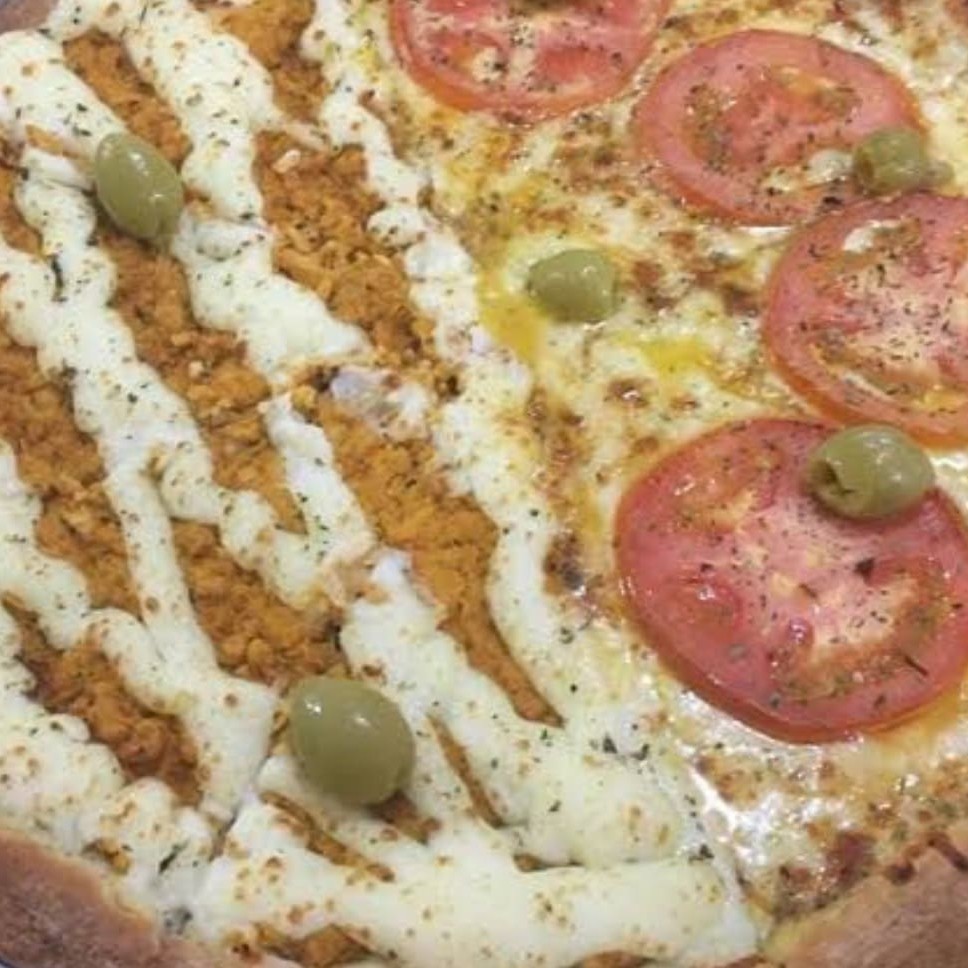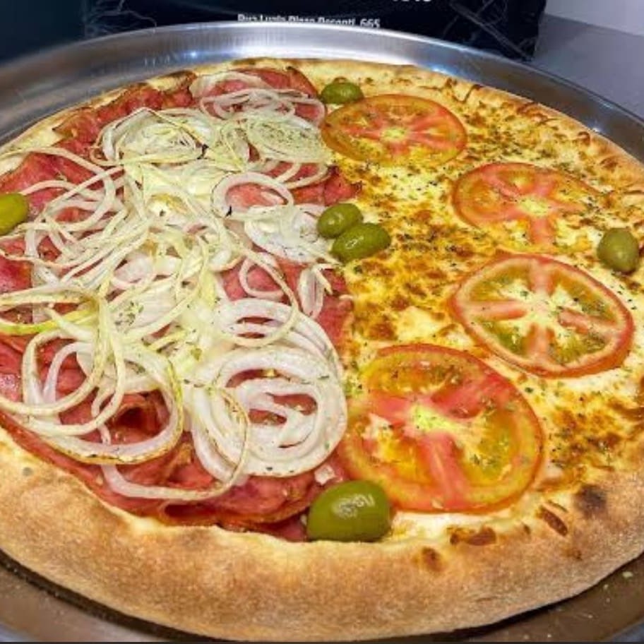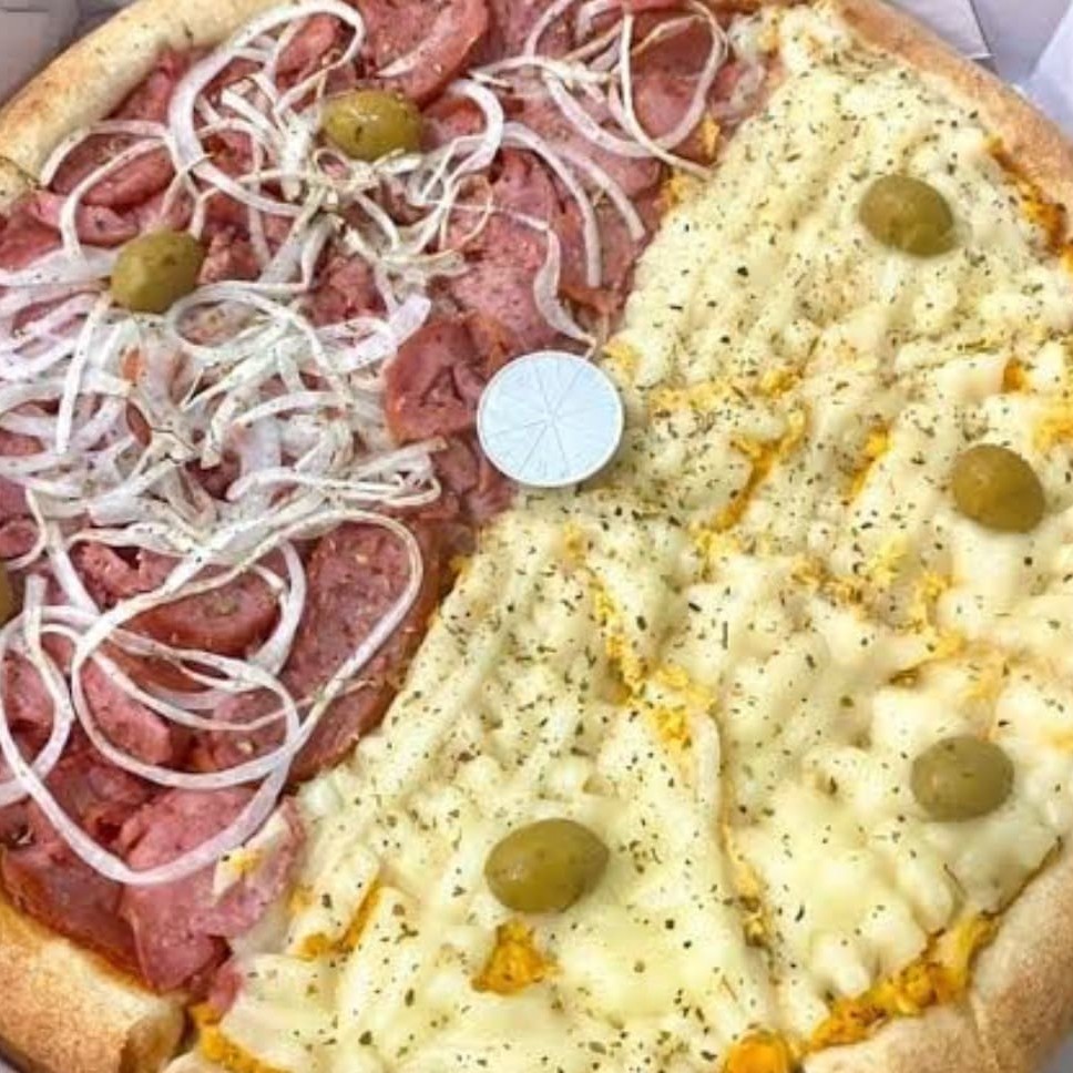 linguiça calabresa fatiada, cebola, azeitonas e orégano, outra metade com molho de tomate com bastante queijo derretido e azeitonas verde