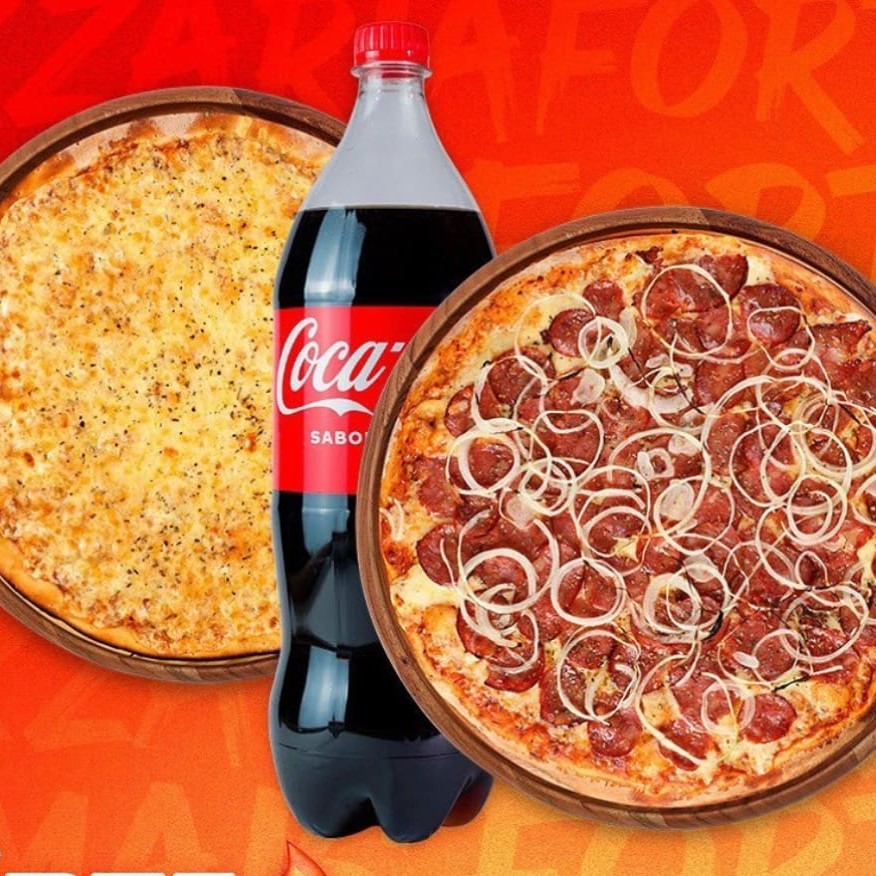 1 deliciosa pizza de mussarela mineira + 1 irresistível pizza de calabresa + 1 coca cola 2 litros bem gelada.