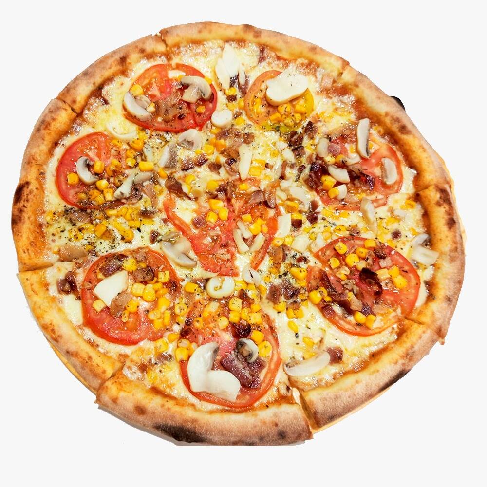 frango,milho,mussarela,calabresa,bacon,molho de tomate, oregano e azeitonas