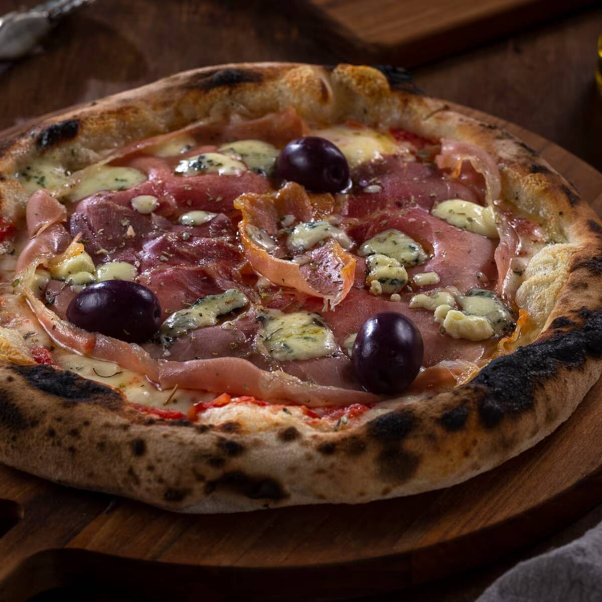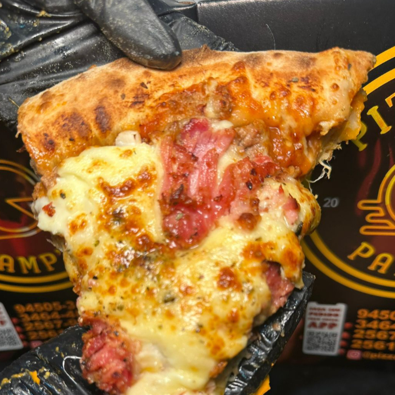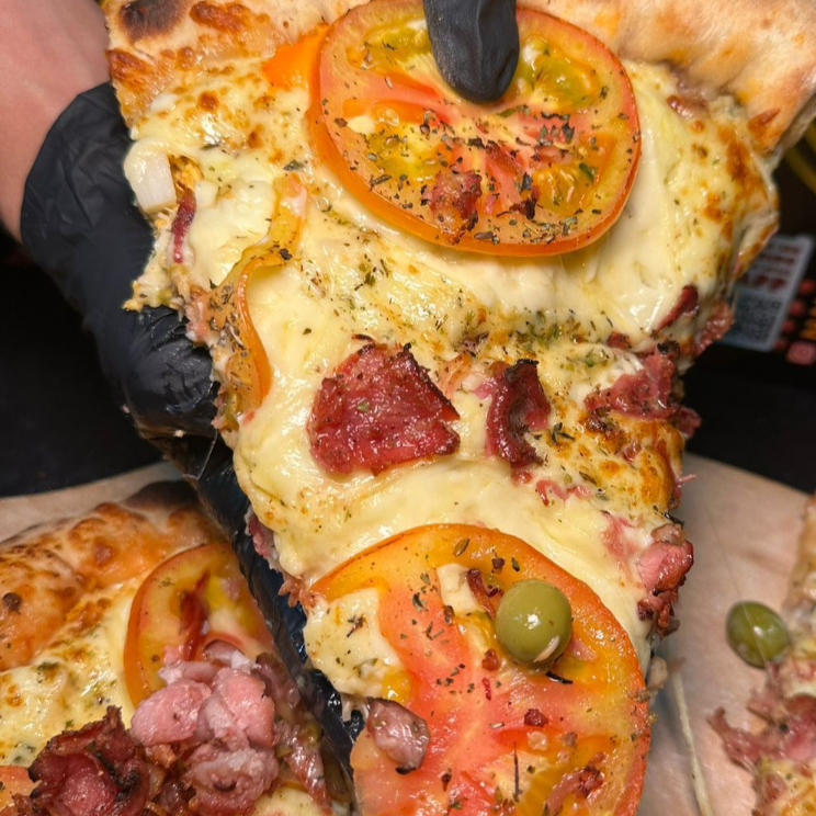 calabresa,ovo,cheddar,mussarela,parmesão,bacon,molho de tomate, oregano,azeitona