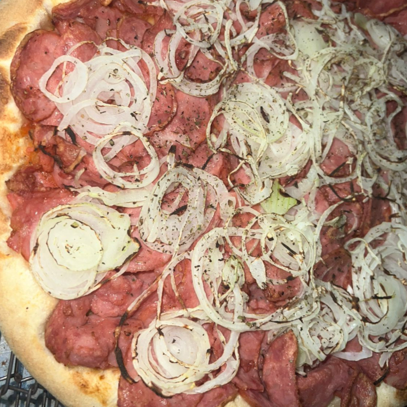 calabresa,cebola,molho de tomate,oregano eazeitonas