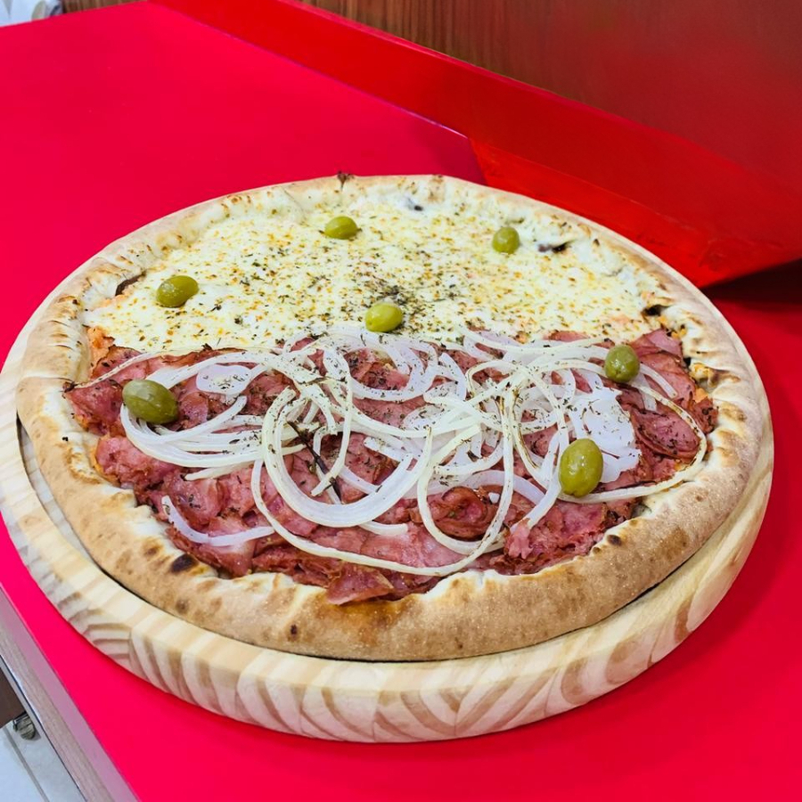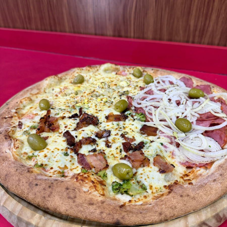 1/2 MUSSARELA, CATUPIRY, PROVOLONE, PARMESAO E GORONZOLA 1/2 BRÓCOLIS, BACON, CHAMPGNON E MUSSARELA