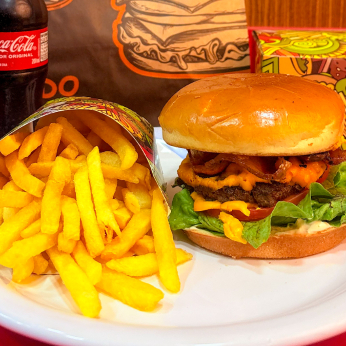 PAO DE BRIÓCHE, HAMBURGUER ARTESANAL, BACON FATIADO, QUEIJO PRATO, ALFACE AMERICANO, TOMATE E MAIONESE VERDE