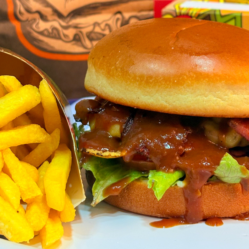 PAO DE BRIOCHE, 2 HAMBURGUERES DE COSTELA, CHEDDAR, BACON, MOLHO BARBECUE , ALFACE, TOMATE E MAIONESE VERDE