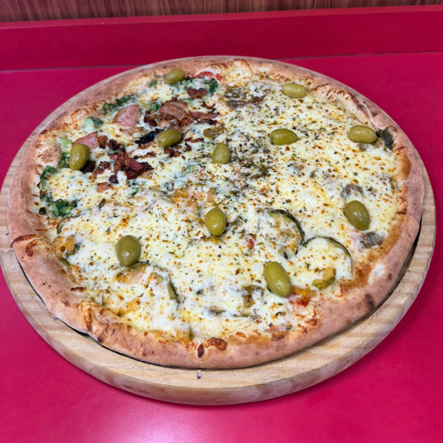 1/3 QUATRO QUEIJOS , 1/3 FRANGO COM CATUPIRY 1/3 CALABRESA ACEBOLADA