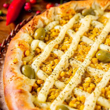 Uma deliciosa pizza acompanhada de milho verde e catupiry.