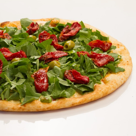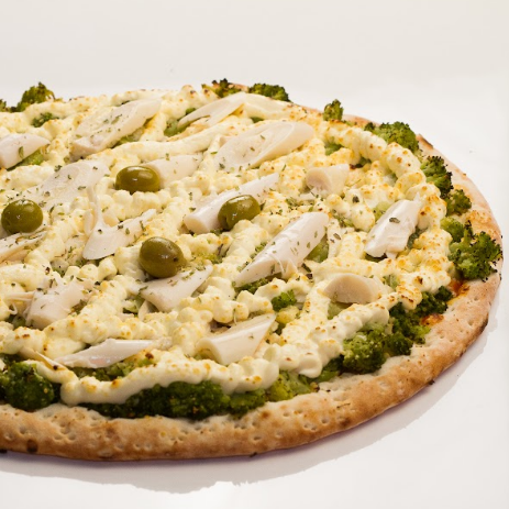 Massa sem glutén*, deliciosa pasta de ricota light, frango desfiado, pequenos cubos de bacon, tomate cereja, leve toque de parmesão e manjericão. * Atenção Celíacos e intolerantes: As pizzas são produzidas em zona mista, por isso contém traços de gutén no compartilhamento da mesma área de produção das pizzas tradicionais