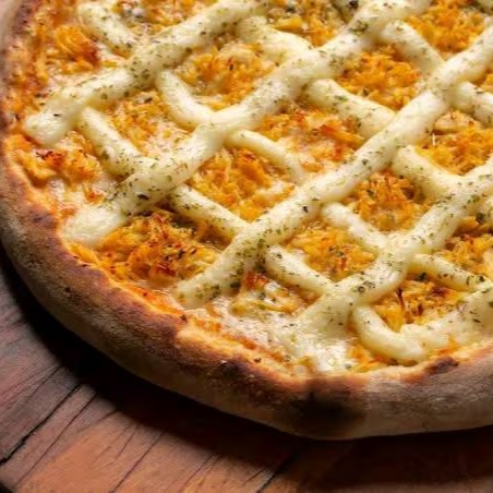 Pizza de Mussarela com Frango e Catupry Original. Bem assadinha no forno a lenha crocante por fora e macia por dentro.