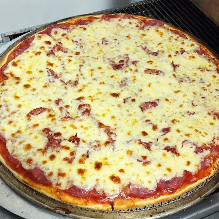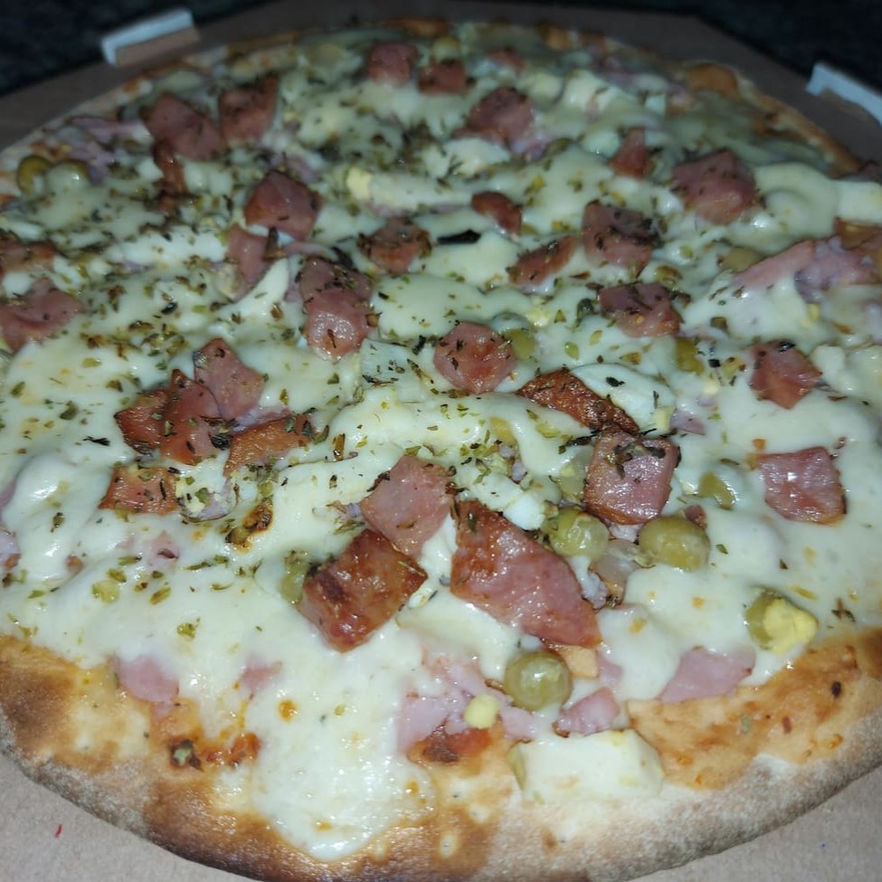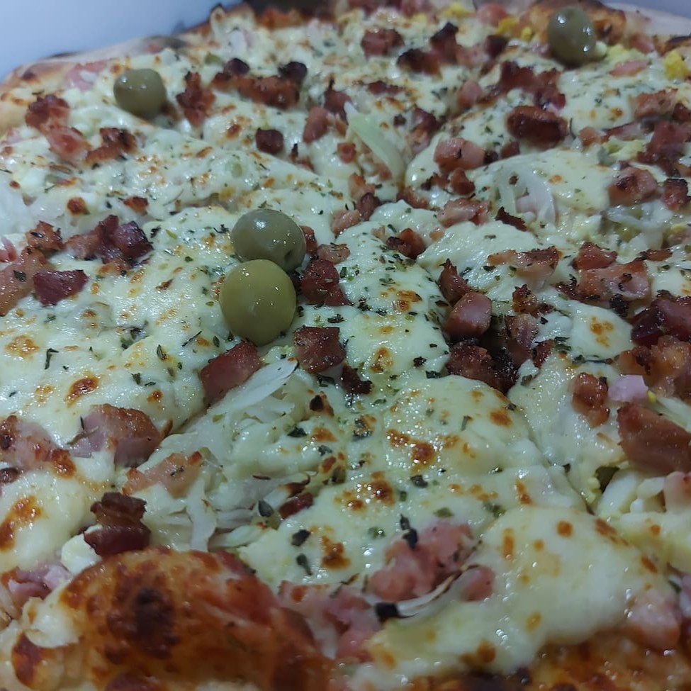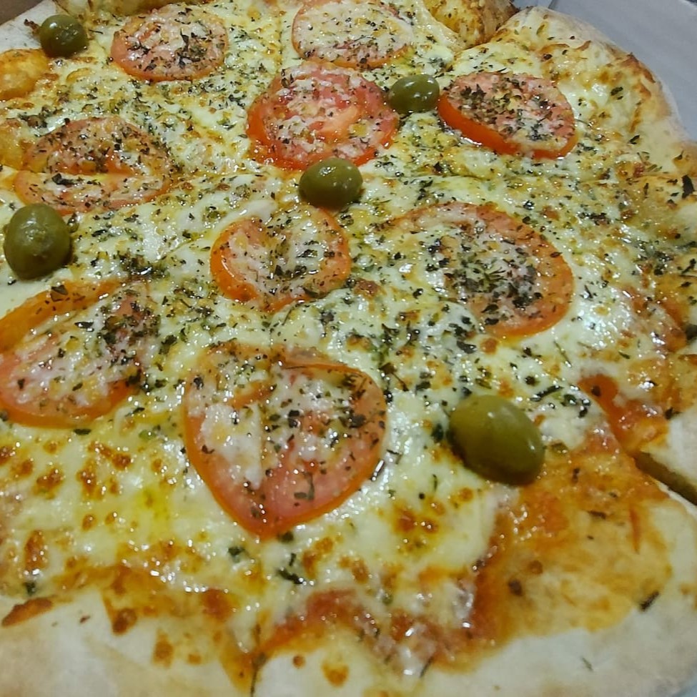 Massa artesanal, delicioso molho de tomate, calabresa fatiada, mussarela derretida, azeitonas e orégano.