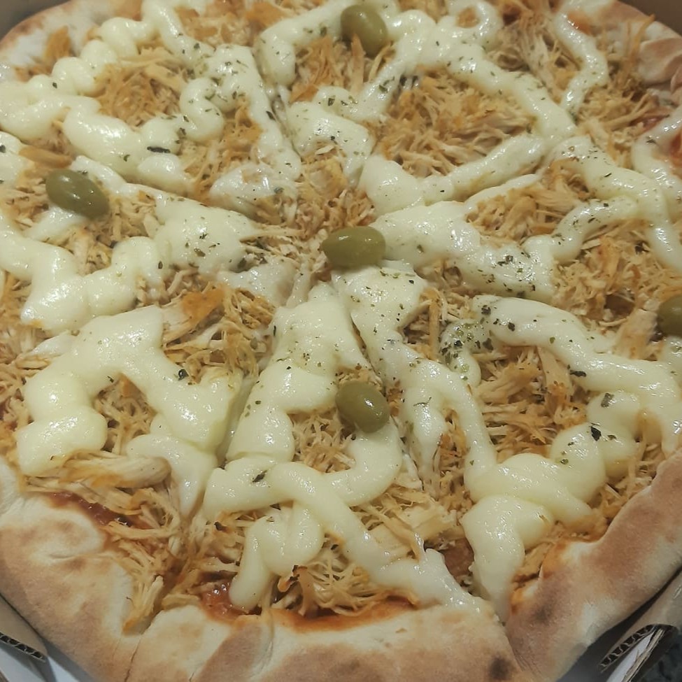 1 Pizza de frango com requeijão cremoso, azeitonas e orégano.